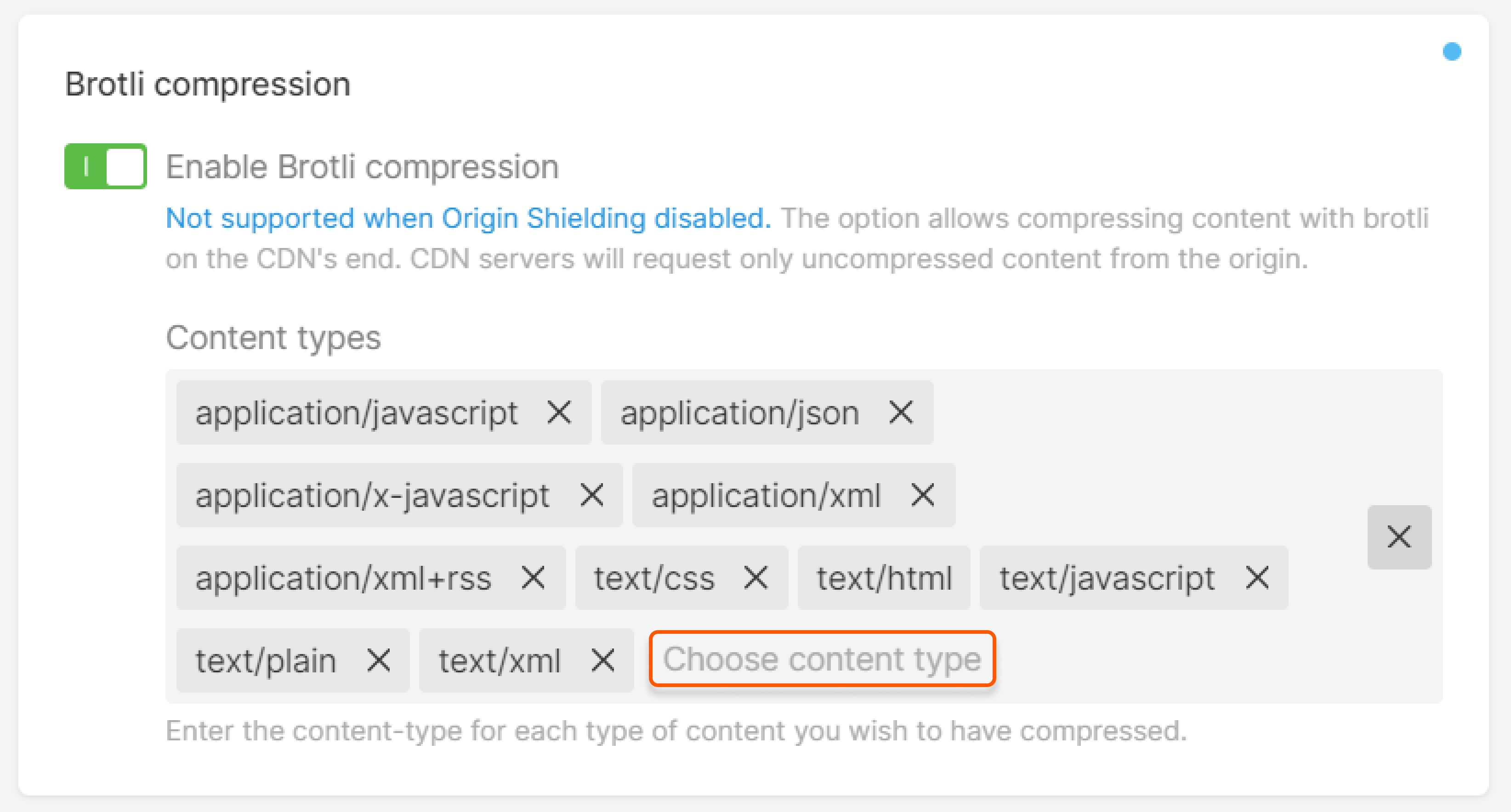 - Brotli compression is only supported when Origin Shielding is enabled. If Brotli is enabled without activating Origin Shielding, the option will not work.