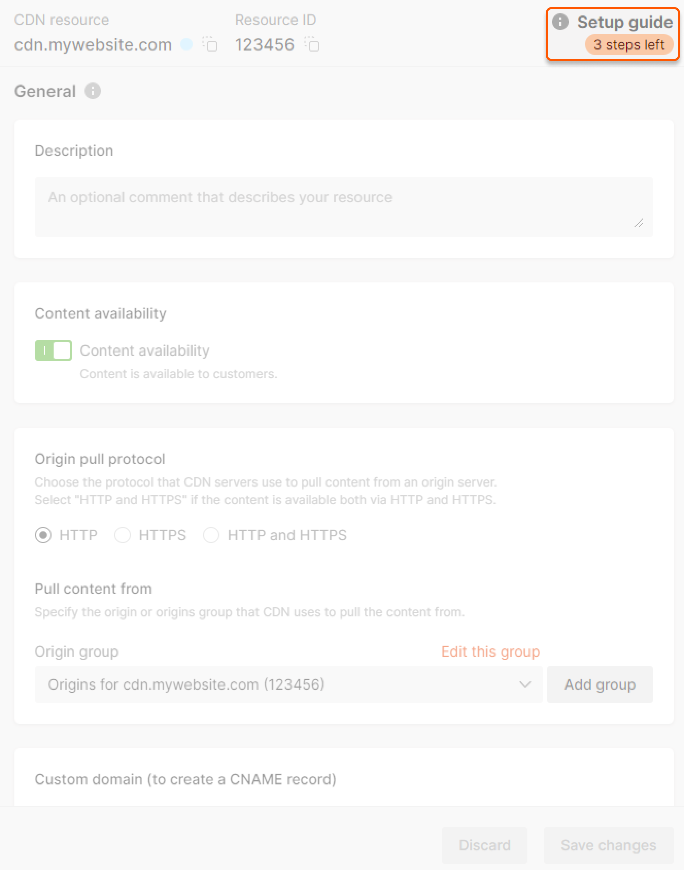 The instructions below describe how to set up a custom domain for static CDN resources with the addition of a CNAME record.
