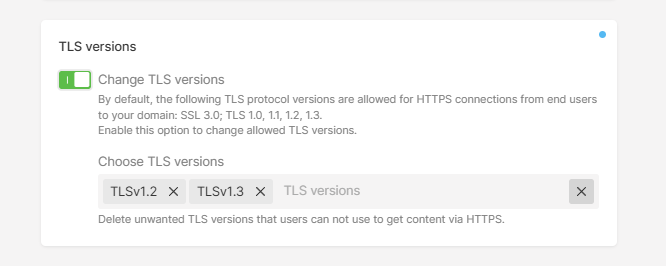 3. Scroll down to the TLS versions section and click the Change TLS versions toggle to specify the necessary versions. The other versions you haven't specified will be blocked.