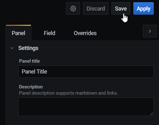 Save the Dashboard. To do this, click "Save" in the upper-right corner of the panel.