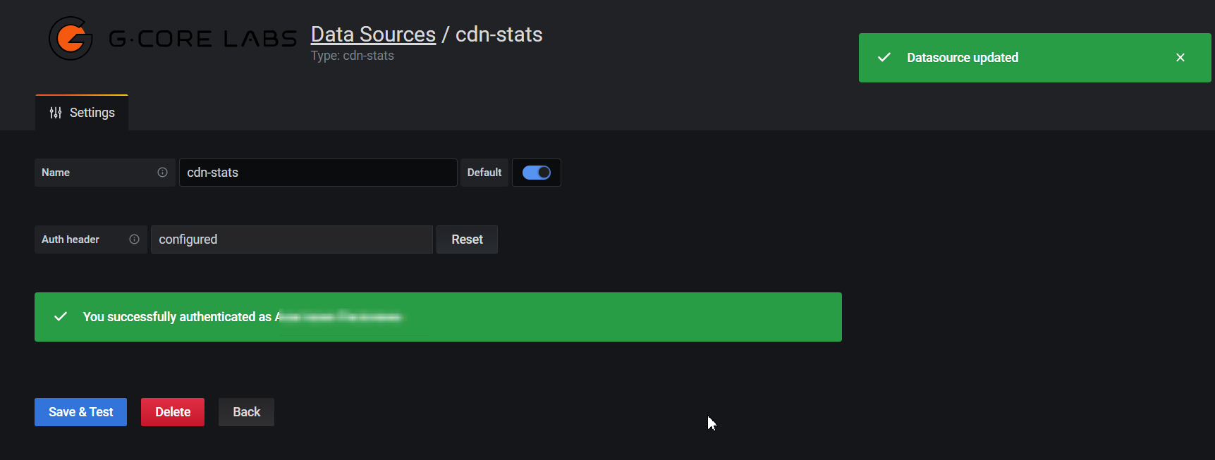 If everything is correct, you will see the following messages: "Datasource updated" and "You successfully authenticated as ".